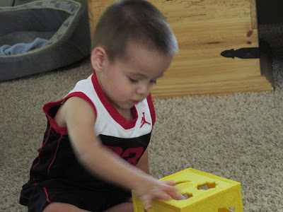 What an adorable little boy. Mine were very comical at his age. His Mom trained him well if he's already putting his toys away. All my granddaughters had one form or another of the shape toy. Glad you had a nice visit.